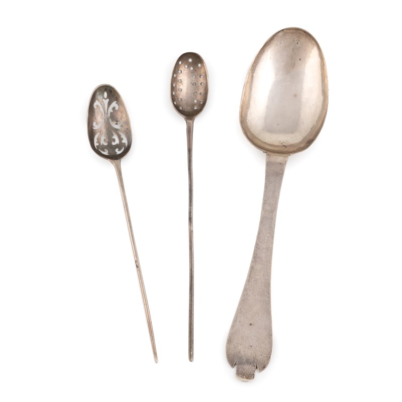 scratched initials to the reverse of the terminal 'I.M.T', length 17.5cm, plus two 18th century mote spoons, total approx. weight 1.3oz. (3)