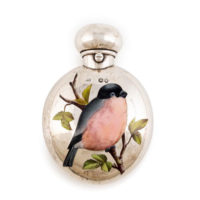 oval form, hinged cover, with a stopper, the front enamelled with a bullfinch, length 7cm, approx. weight 1.4oz.