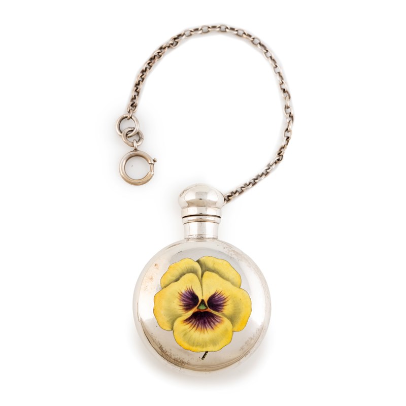 circular form, screw-off cover with a chain attachment, the front enamelled with a yellow pansy, diameter 4.5cm, approx. weight 1.1oz.