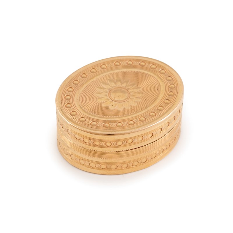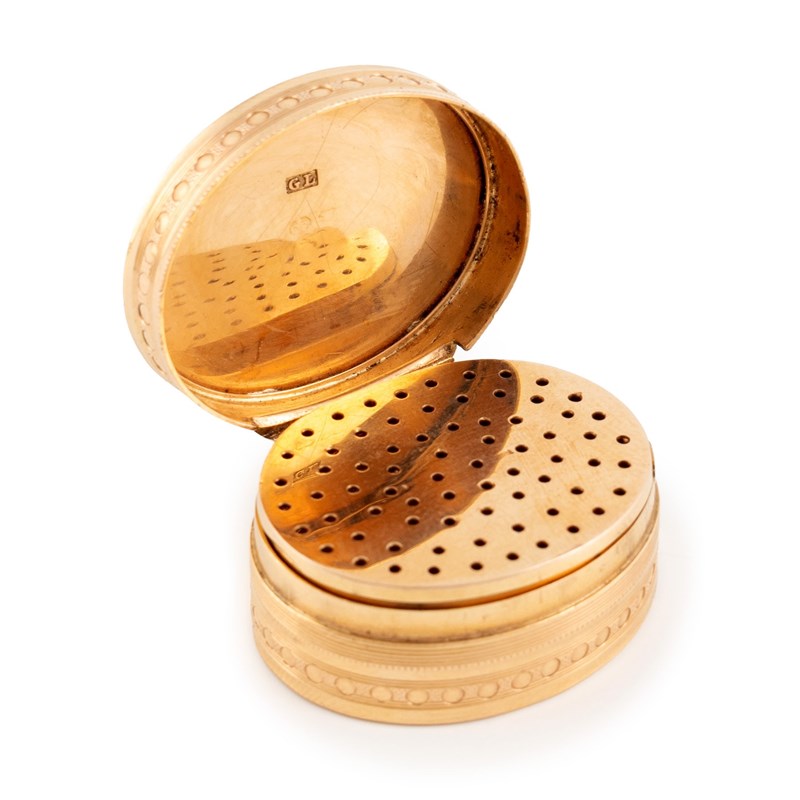 oval form, engine-turned and foliate decoration, the interior with a hinged pierced grille, length 2.9cm, approx. weight 17.8g.