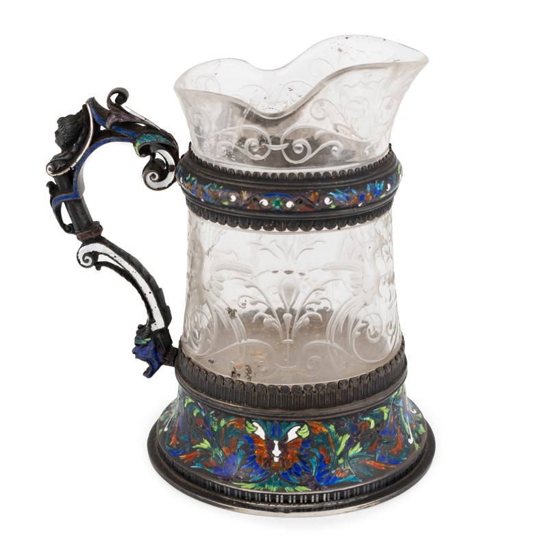 A 19th century Austrian silver and enamel-mounted rock crystal jug,