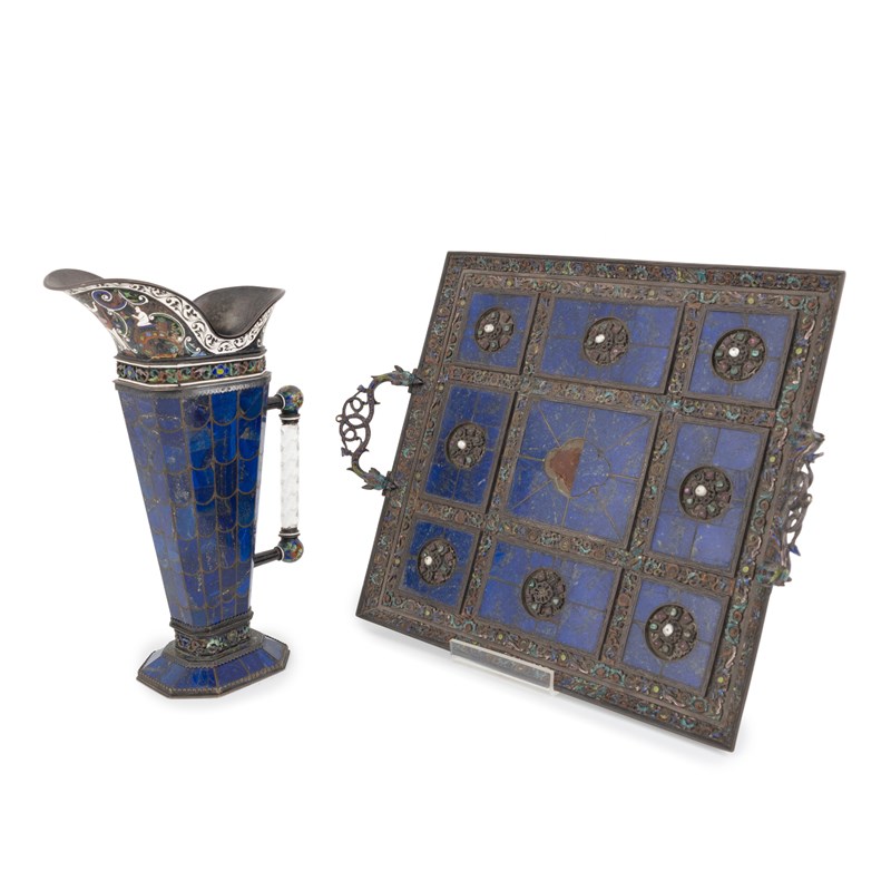 A 19th century Austrian silver and enamel-mounted lapis lazuli ewer and two-handled tray,