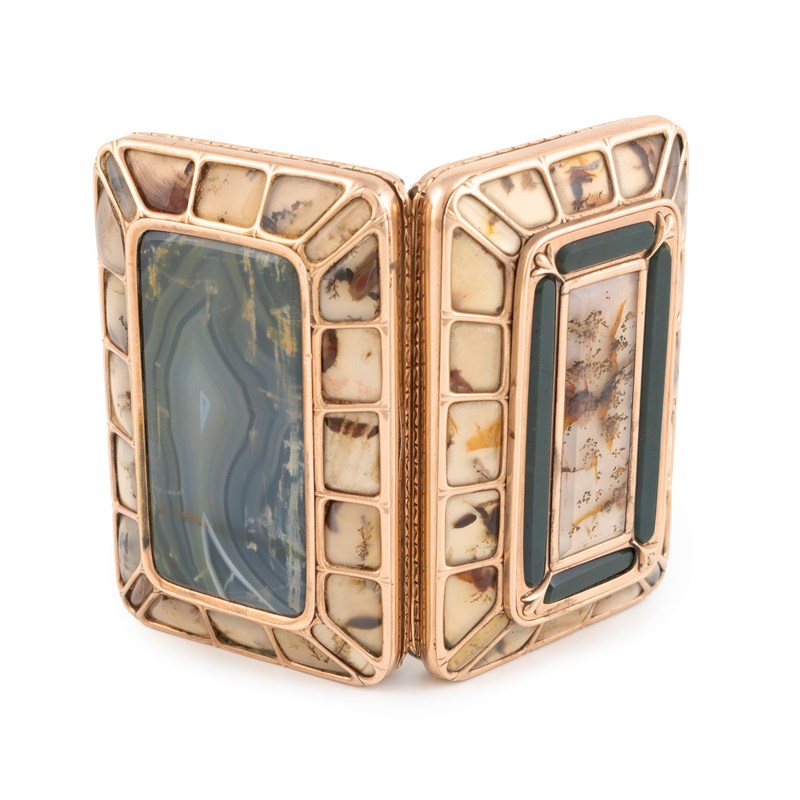 rectangular form, the hinged cover set with four bloodstone panels and with panels of moss agate, the base with a blue/green agate panel and smaller panels of moss agate, length 7.2cm, approx gross weight including agate panels 155g.