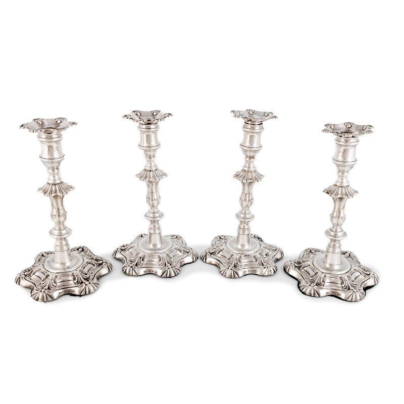 knopped baluster stems, shell shoulders, spool-shaped capitals, detachable drip pans, on hexafoil bases, engraved with a crest, height 23cm. (4)