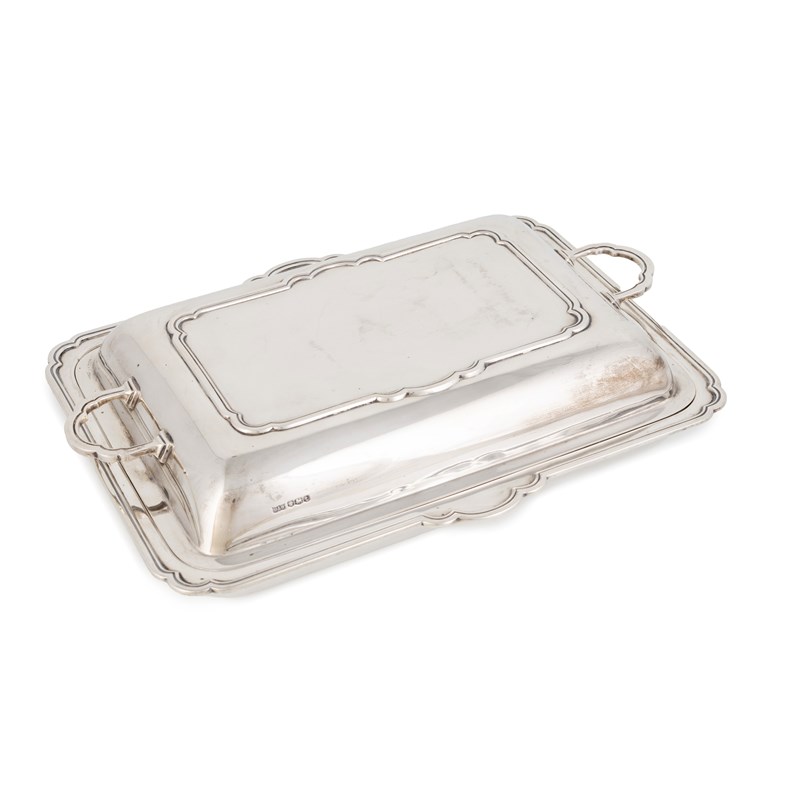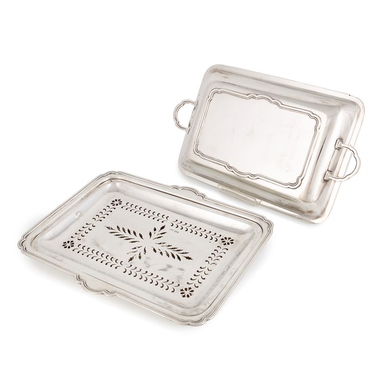 rectangular form, pull-off cover with side handles, the interior with a plain liner and a pierced liner, length 29.1cm, approx. weight 74.9oz.