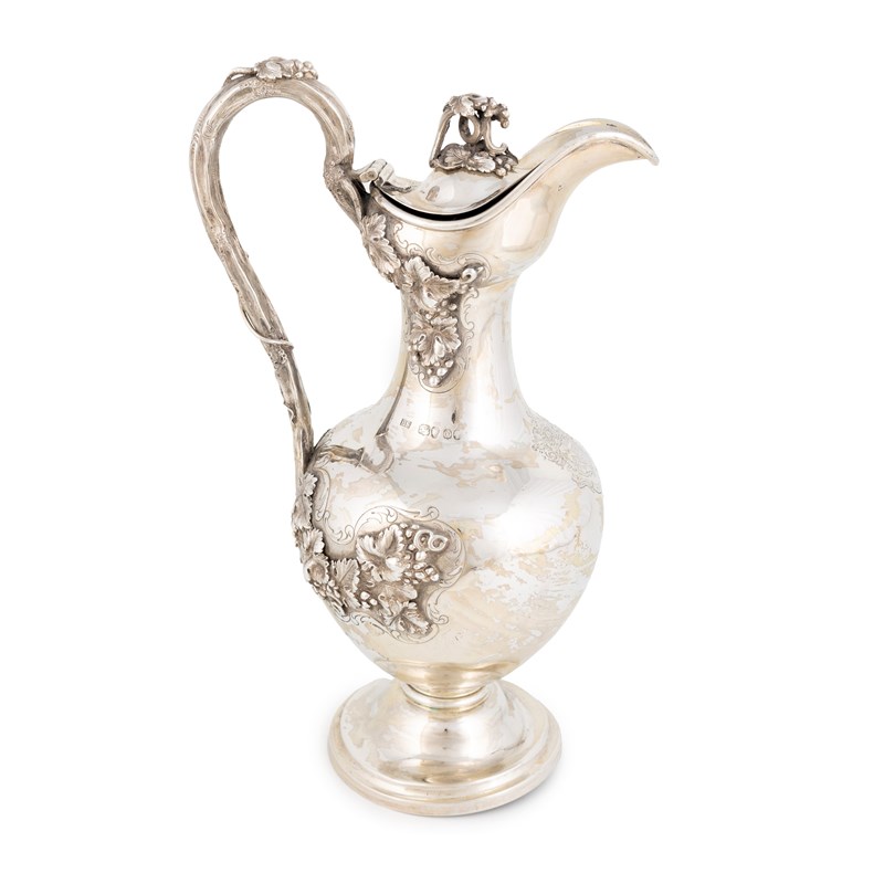 baluster form, embossed vine and grape decoration, simulated vine scroll handle, the hinged cover with a pierced vine finial, the front with an armorial within foliate mantling, height 33cm, approx. weight 32.8oz.