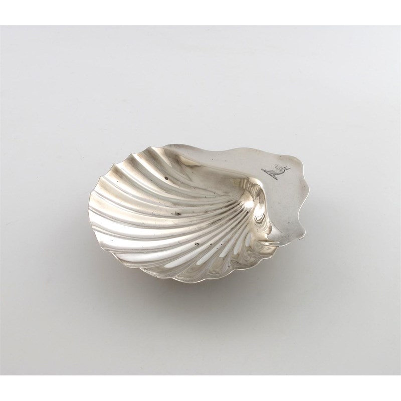 conventional shell form, on three winkle feet, engraved with a crest, length 15.4cm, approx. weight 3.2oz.