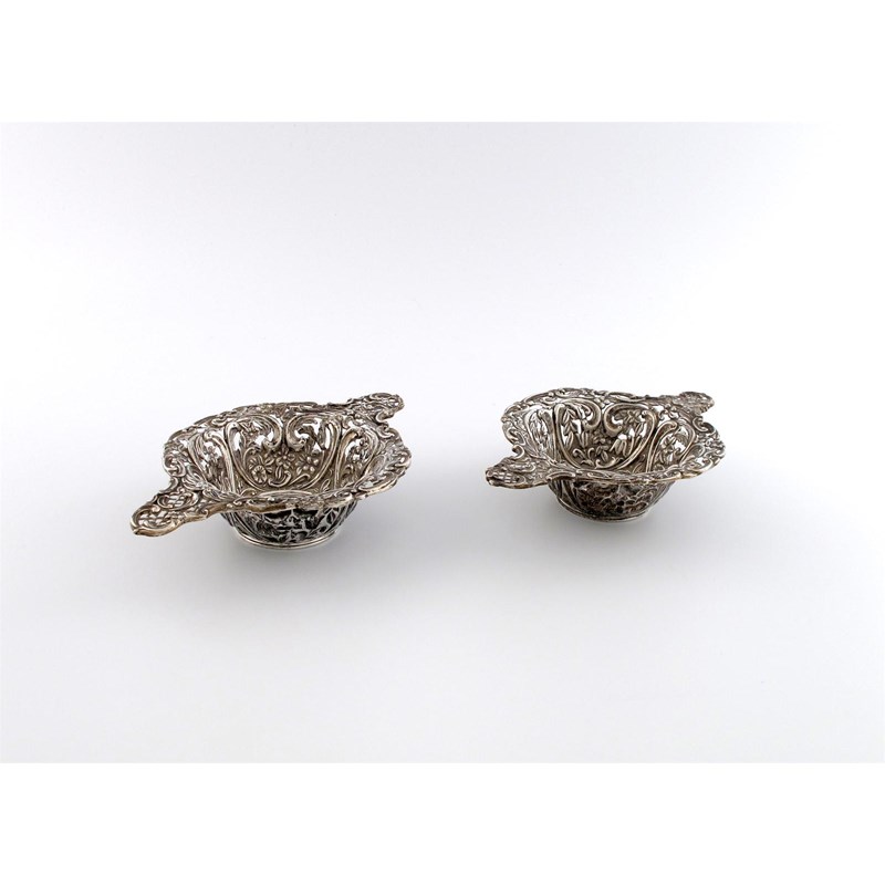 Chester 1894 and Birmingham 1895, two makers, circular form, pierced and embossed with foliate scroll decoration, pierced side handles, length handle to handle 17.5cm, approx. weight 5oz. (2)
