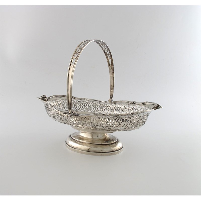 shaped oval form, pierced foliate scroll decoration, pierced swing-handle, on a raised oval foot, length 29cm, approx. weight 16oz.