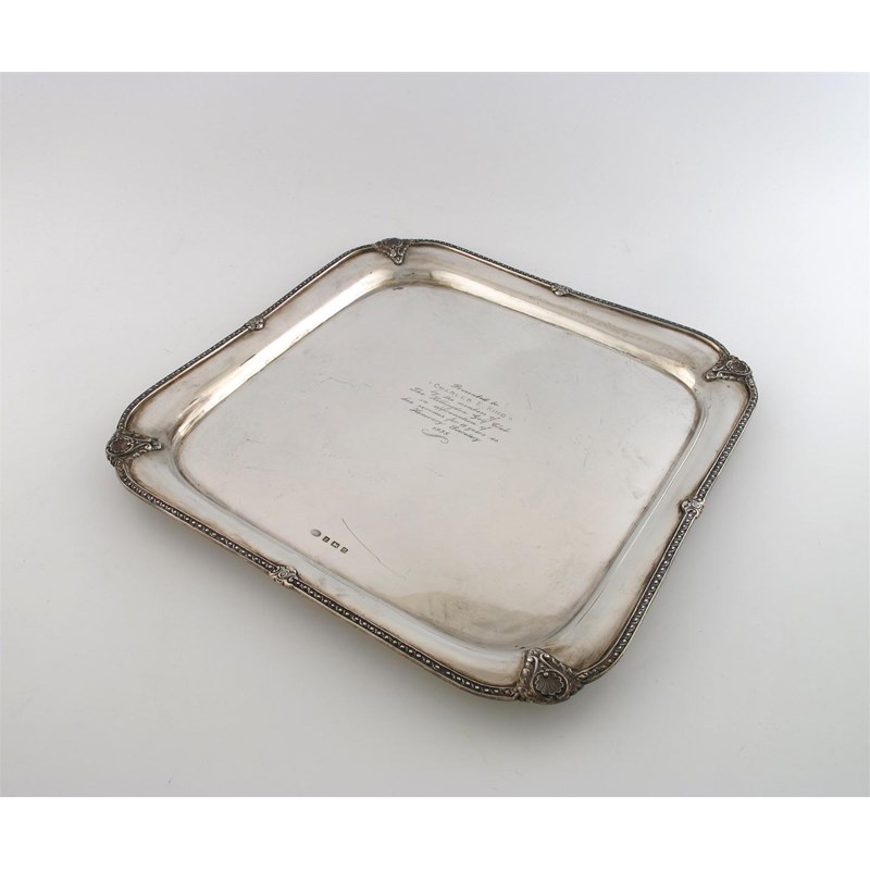 square form, foliate scroll, bead and shell border, on four bun feet, inscribed, width 35.5cm, approx. weight 50oz.