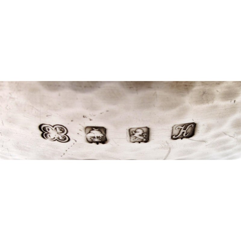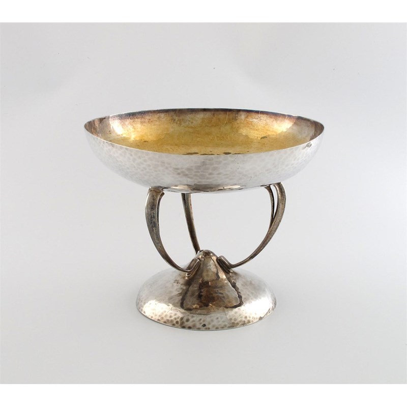 circular form, spot-hammered decoration, the interior of the bowl gilded, on three scroll supports on a raised circular base, height 16cm, approx. weight 17oz.