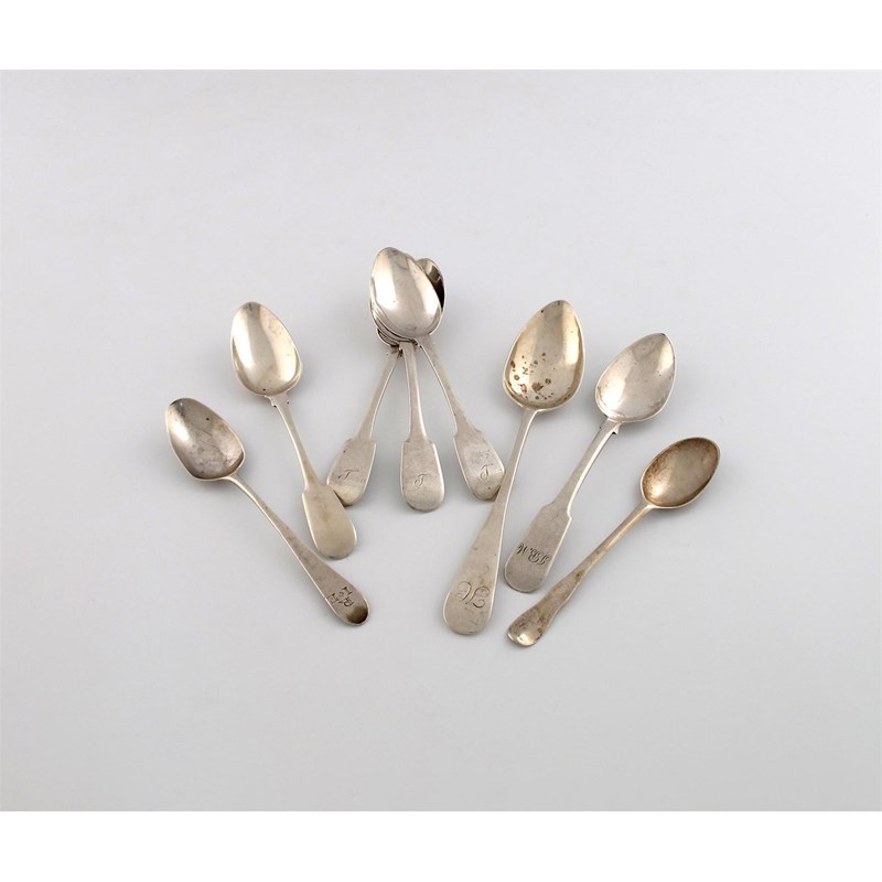 comprising: three Aberdeen Fiddle pattern teaspoons, by George and Alexander Booth, Aberdeen circa 1830, a small dessert spoon by James Pirie, Aberdeen circa 1820, a teaspoon by Alexander Cameron, Dundee circa 1820, a teaspoon by Alexander Mollison, Aberdeen, plus another spoon and an English teaspoon by Peter and Jonathan Bateman, approx. weight 4.2oz. (8)