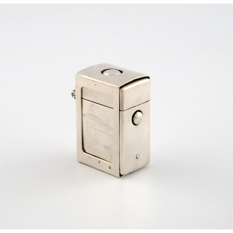 rectangular form, hinged cover with a push-action clasp, with a glass liner, and with an outer silver slide off case, approx. weight 3oz, height 5.2cm.