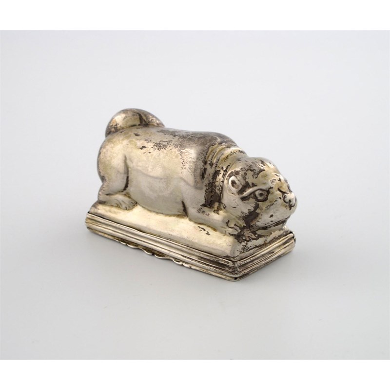 modelled as a recumbent dog, hinged base with a foliate motif, length 8cm, approx. weight 2.3oz.