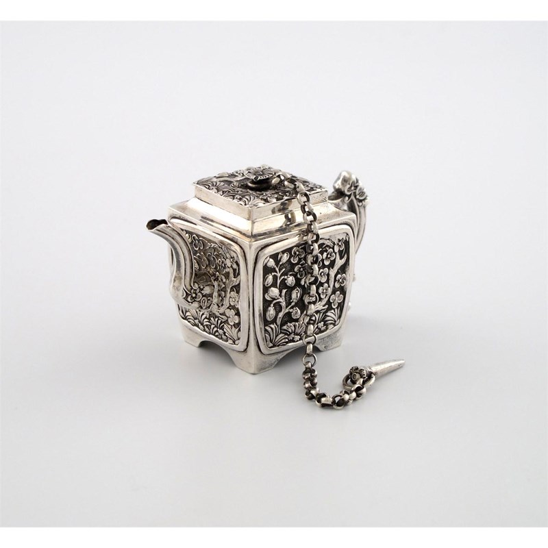 square form, chased foliate decoration, hinged cover, the spout with a stopper on a chain, on four bracket feet, length handle to handle 6.3cm, approx. weight 1oz.
