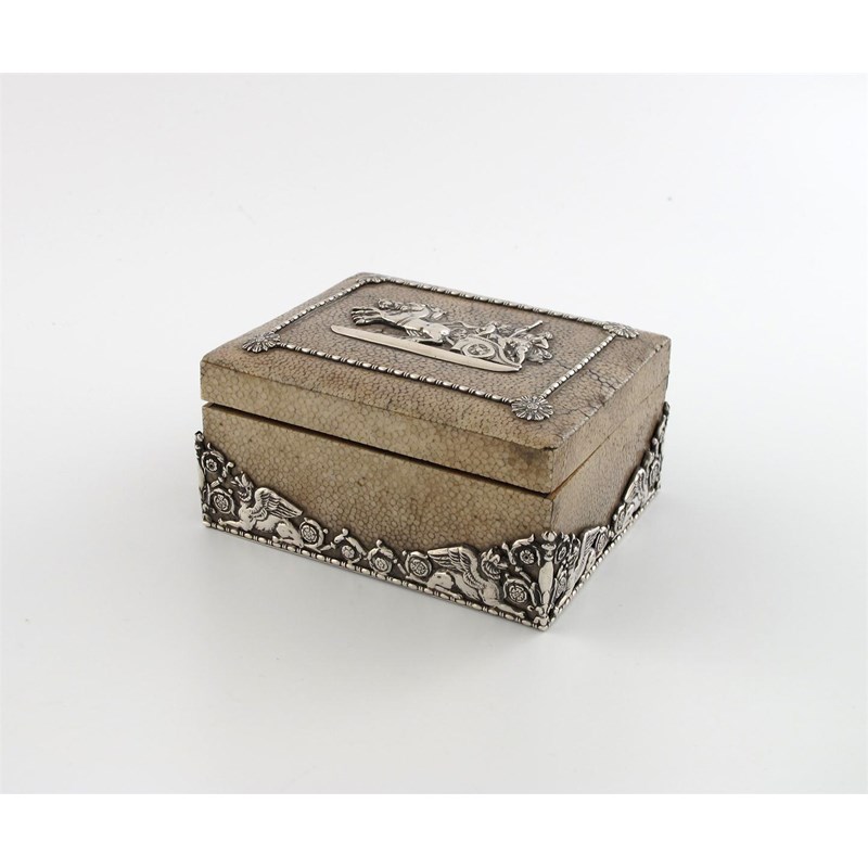 rectangular form, the hinged cover applied with a chariot within a border, the base with pierced classical mounts, the inside tortoiseshell lined, length 11.4cm.