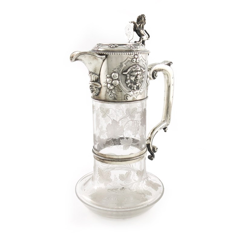 the tapering circular bellied glass body etched with trailing grapevines and foliate decoration, the mount with Bacchus masks on a matted background, scroll handle, beaded borders, the hinged cover with a rampant lion thumb-piece holding a shield, engraved with a crest, height 27.8cm.