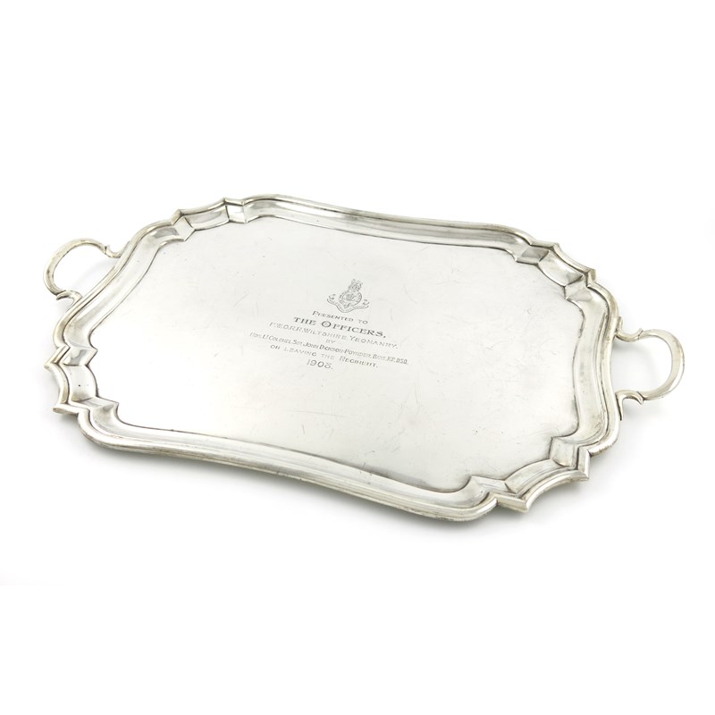 rectangular form, canted corners, moulded border, inscribed with a regiment badge and 'Presented to the Officers P.W.O.R.R Wiltshire Yeomanry by The Hon. Lt. Colonel Sir John Dickson-Poynder, Bart. M.P, D.S.O on leaving the Regiment, 1908', scroll handles, length 61.5cm, approx. weight 91oz.