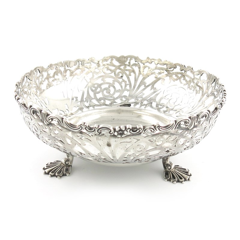 circular form, pierced foliate scroll decoration, wavy-edge scroll border, on three pierced webbed feet, diameter 22,3cm, approx. weight 19oz.