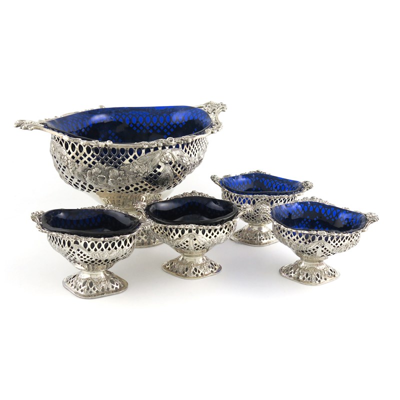 comprising one large dish and four smaller dishes, oval form, pierced and embossed foliate decoration, on raised shaped oval bases, foliate scroll borders, with blue glass liners, length 28.5cm and 13.8cm, approx. weighable 43oz. (5)
