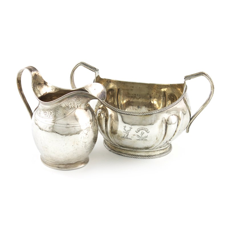 oval bellied form, scroll handle, engraved decoration, the front with a worn crest, plus a George III Irish silver two-handled sugar bowl, by Richard Sawyer, Dublin 1805, oval form, rope-work borders, approx. total weight 13.5oz. (2)