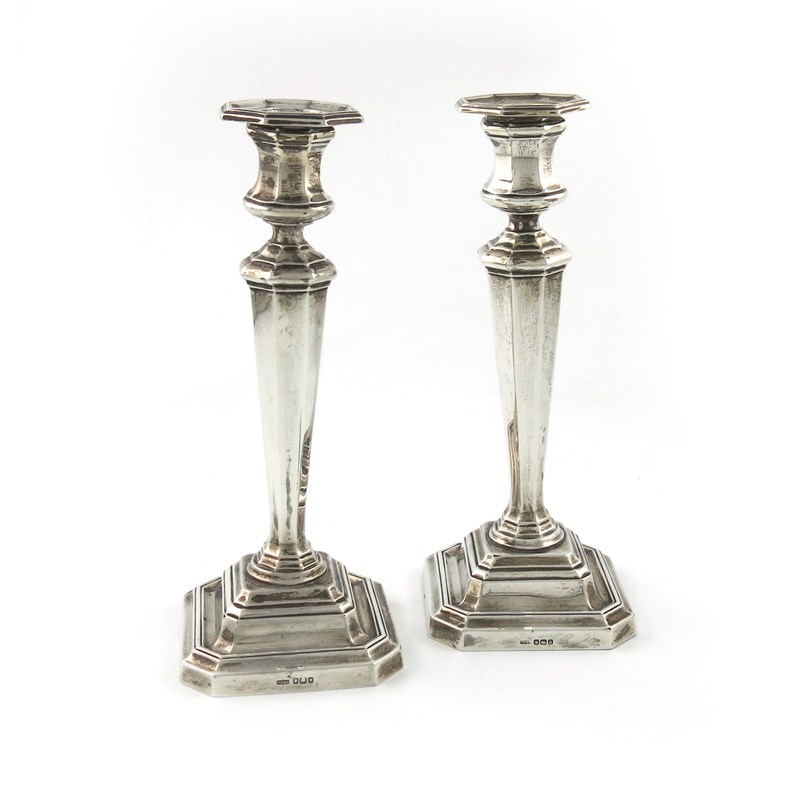 octagonal tapering stems and capitals, on raised square bases with canted corners, height 20.8cm. (2)