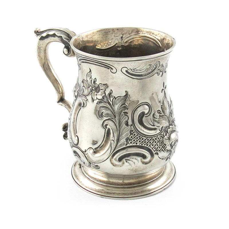 baluster form, leaf capped scroll handle, later embossed foliate scroll decoration, on a circular foot, height 10cm, approx. weight 8oz.