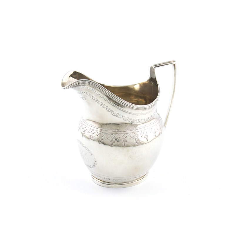oval form, engraved decoration, reeded scroll handle and borders, engraved with initials, height 10cm, approx. weight 3.9oz.