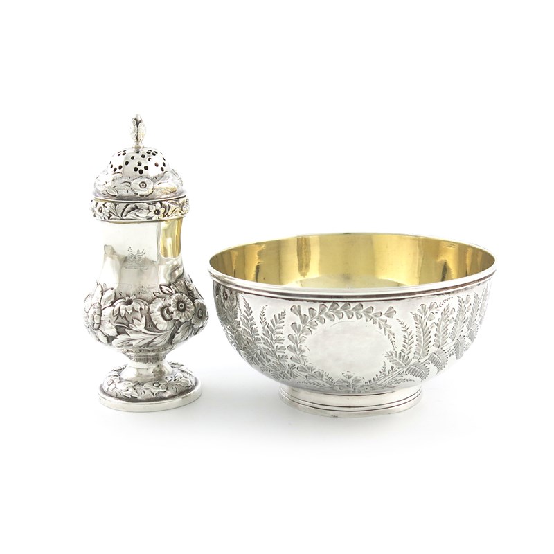 baluster form, embossed foliate decoration, engraved with a crest, plus a Victorian silver bowl, by George Adams, London 1877, circular form, engraved fern decoration, gilded bowl, approx. weight 7.5oz. (2)