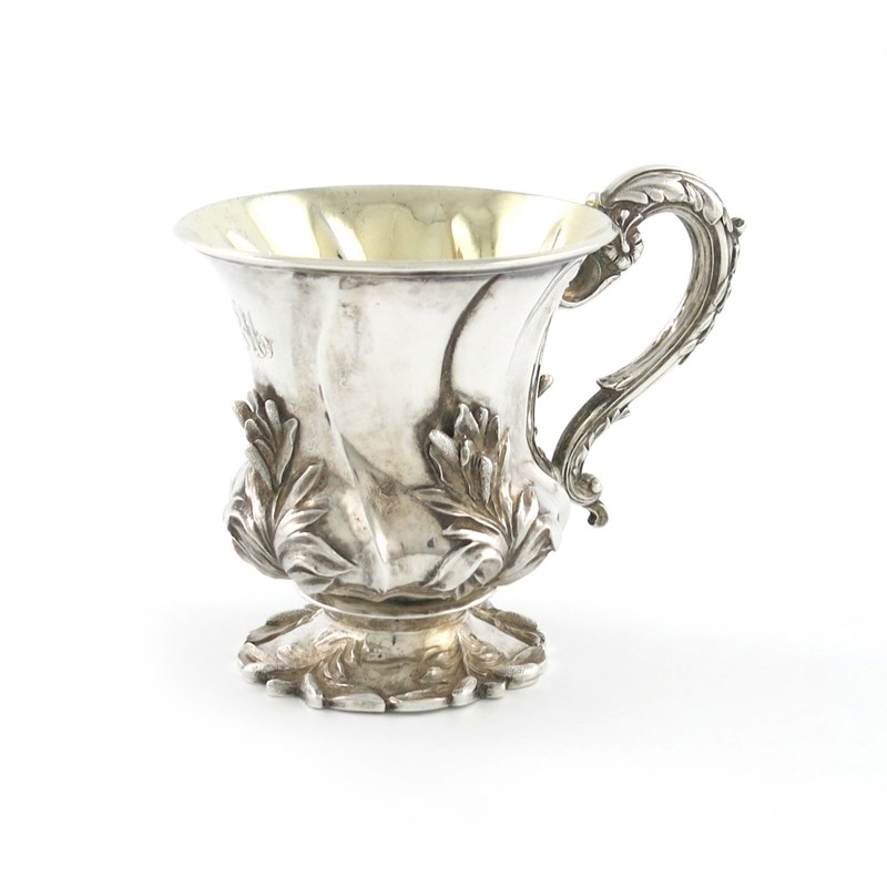 campana form, leaf capped scroll handle, applied foliate decoration, on a shaped circular foliate foot, height 9.3cm, approx. weight 5oz.
