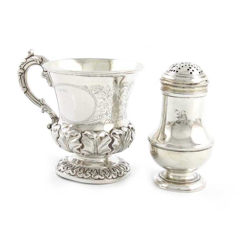 bun form, baluster body, on a circular foot, height 9.2cm, plus a William IV silver christening mug, London 1833, inscribed 'George Bailey from his God Father Frederick George Hilton Price', height 9cm, approx. weight 7.5oz. (2)