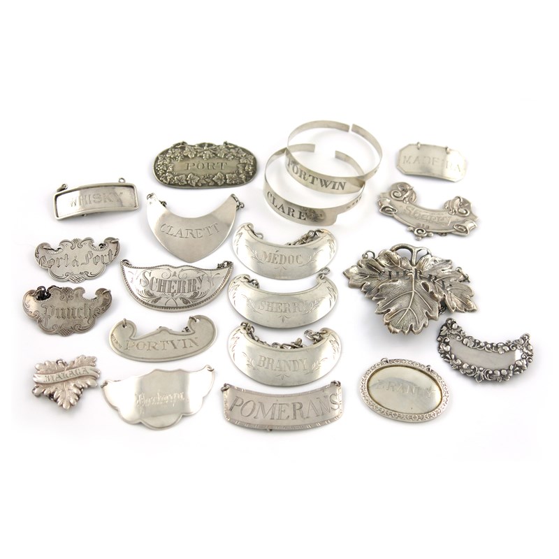 comprising: a Maltese label, oval form, engraved 'BRANDY', an Indian colonial label, by Hamilton and co, incised 'WHISKY', plus Swedish examples and others. (20)