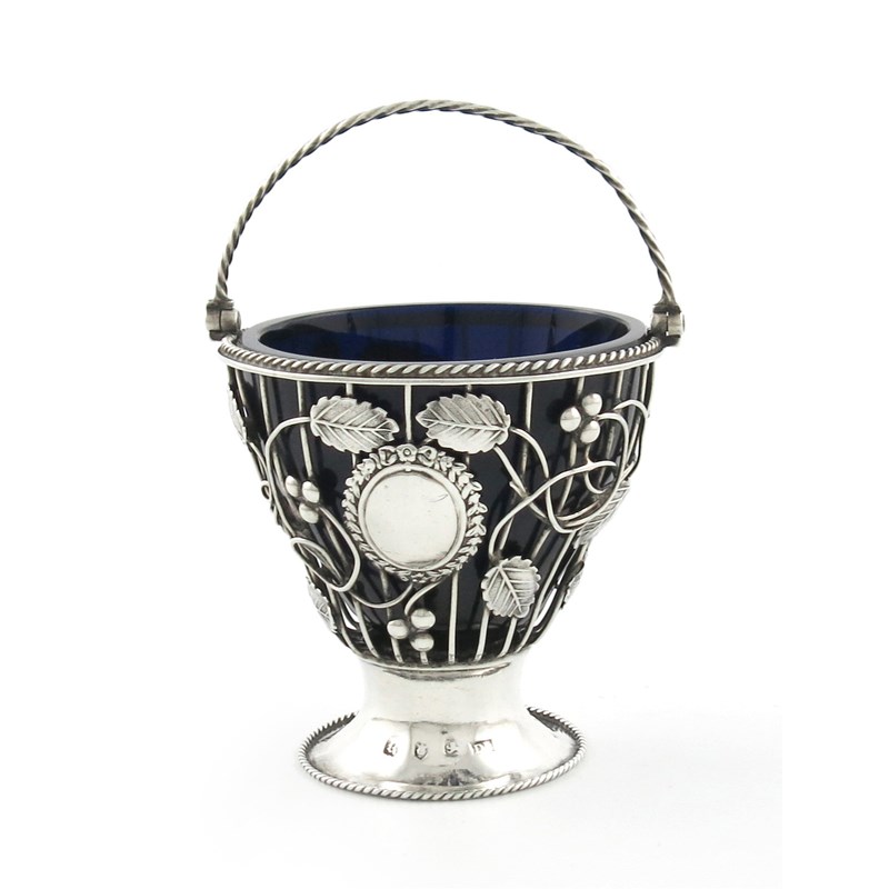 circular wire-work form, rope work borders and swing-handle, blue glass liner, height 8.5cm, approx. weight 3oz.