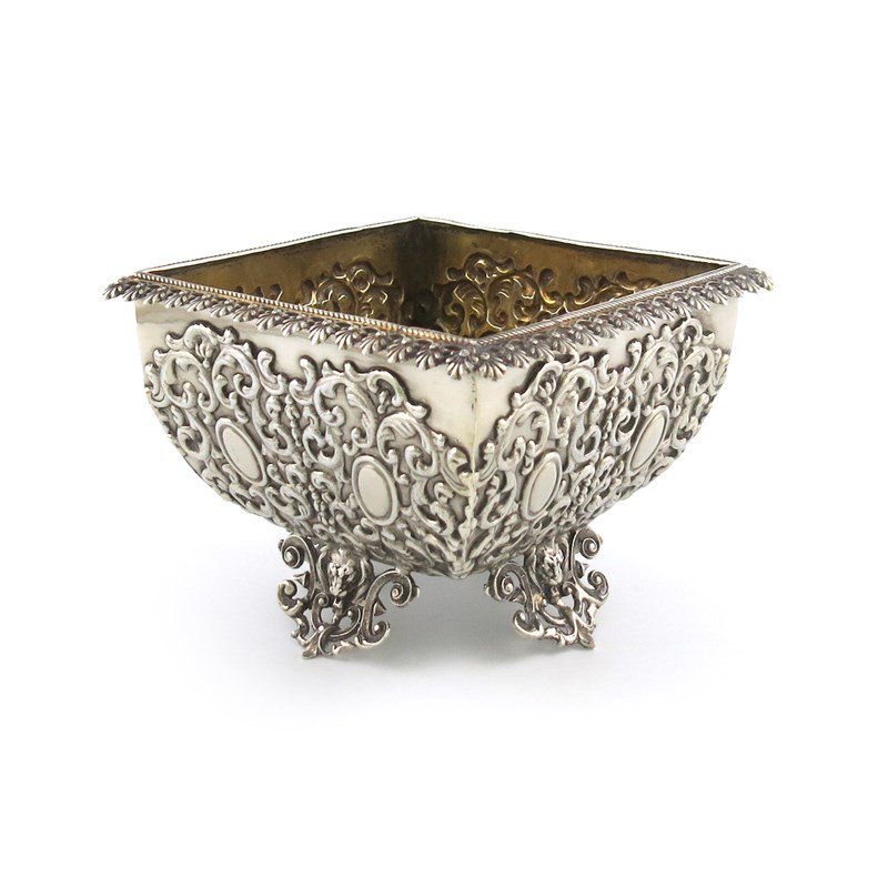 tapering square form, embossed foliate scroll decoration and with oval lobes, gilded interior, on four pierced bracket feet, length 12.8cm, approx. weight 9oz.