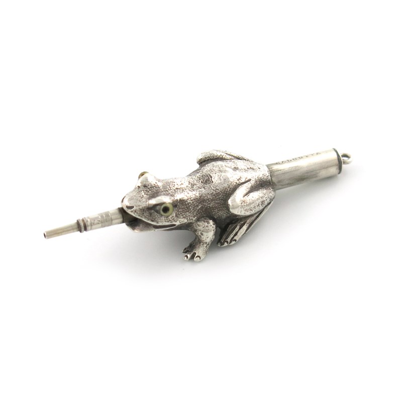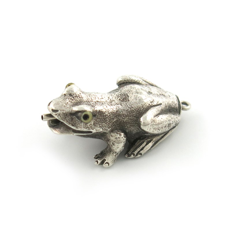 modelled as a frog, set with glass eyes, ring terminal, length 3.2cm.