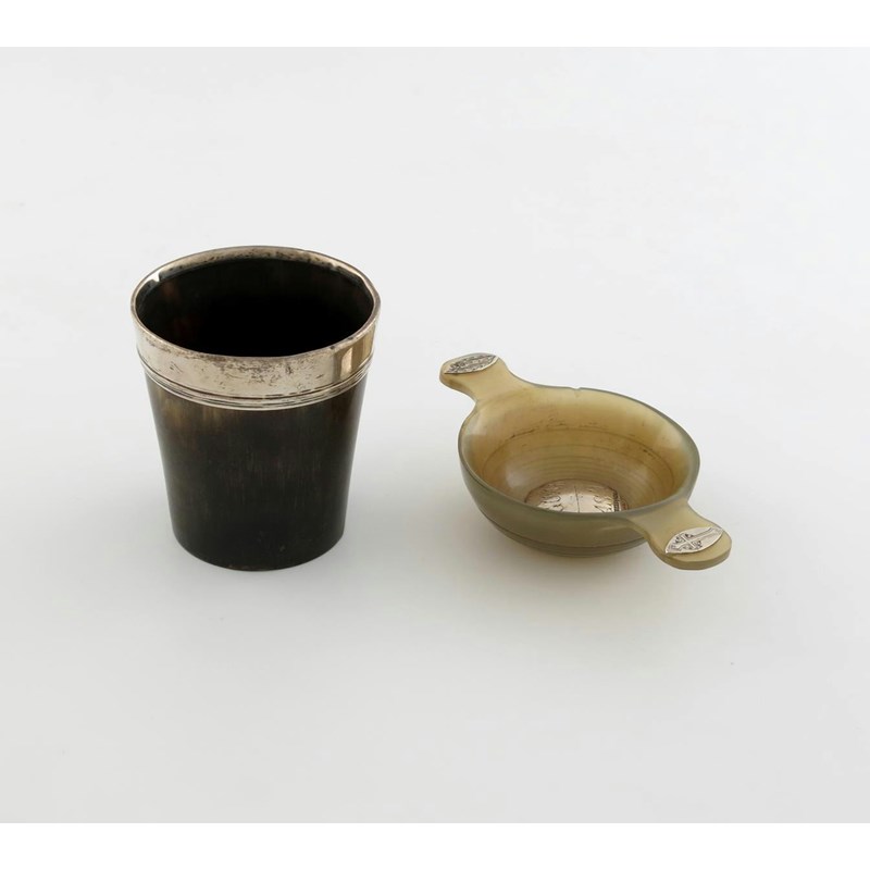 the base with an inscribed circular disc, 'SCUAB AS'I', the handles engraved with a thistle and a cross, length 11.2cm, plus a silver-mounted horn beaker, of tapering circular form, plain mount, height 6.7cm. (2)