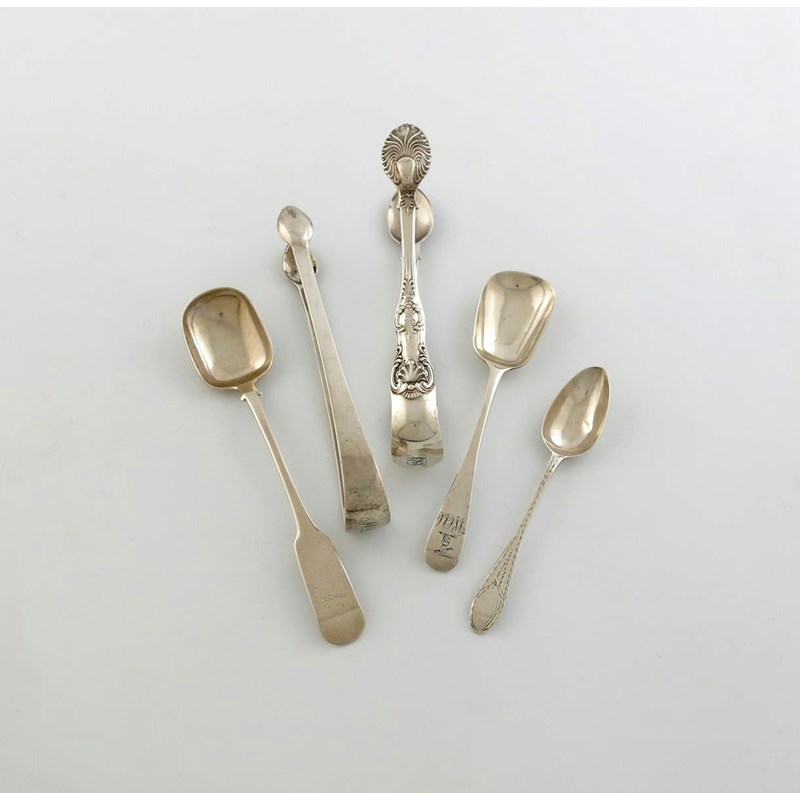 comprising: a Scottish provincial Fiddle pattern sugar spoon, by William Whitecross, Aberdeen, circa 1810, an Exeter sugar spoon, two pairs of Scottish sugar tongs, and an Irish bright-cut teaspoon, marked Sterling, approx. weight 4.7oz. (5)
