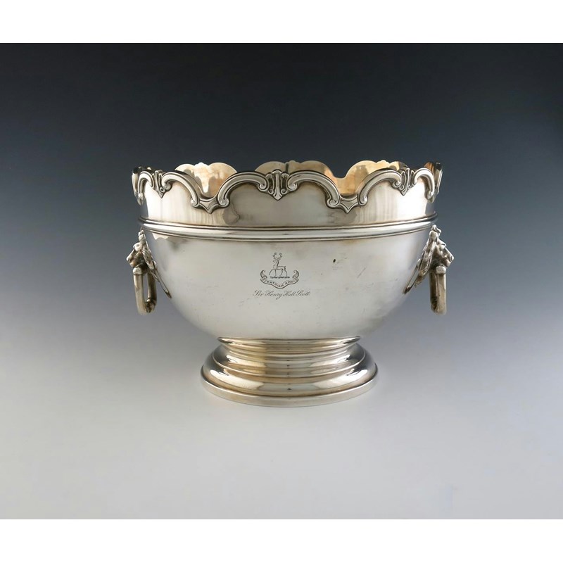 circular form, lion mask drop ring handles, castellated scroll border, on a raised circular foot, engraved with a crest and inscribed 'Sir Henry Hall Scott', diameter 27cm, approx. weight 70oz.