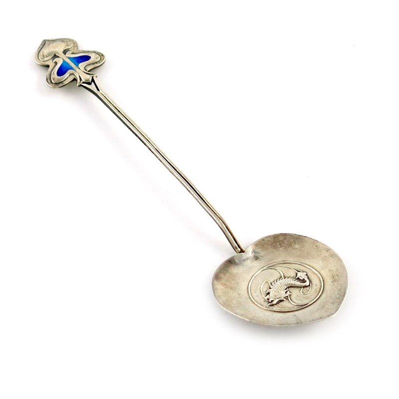 the heart shaped bowl embossed with a central fish, the finial with sinuous and two colour blue enamel decoration, length 13cm, approx. weight 0.4oz.