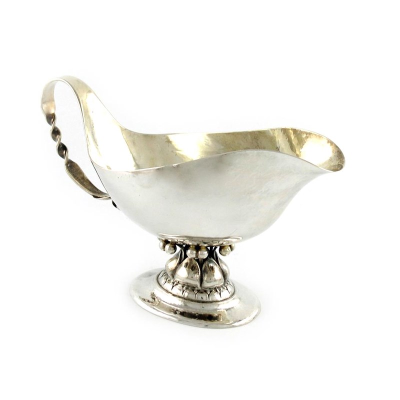 oval form, twisted scroll handle, spot-hammered decoration, on a raised oval base with bud decoration, length 24cm, height 14cm, approx. weight 13oz.