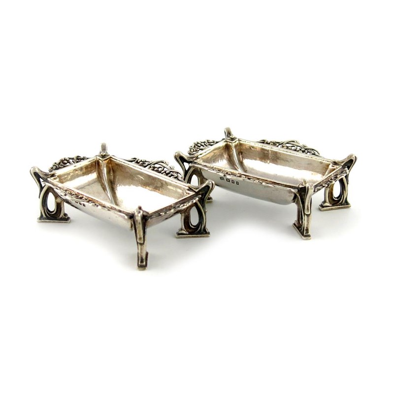 rectangular form, spot-hammered decoration, cast pierced scroll and bud borders, on four pierced sinuous legs terminating in rectangular feet, length 9.7cm, approx. weight 6.2oz. (2)