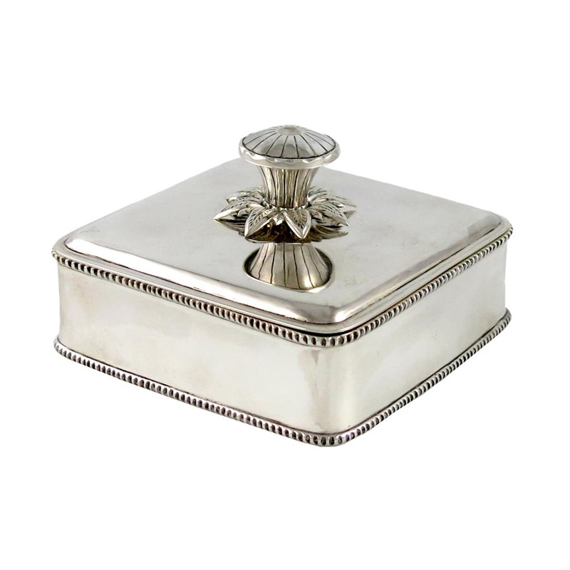 square form, beaded borders, the pull-off cover with a flower finial, length 10cm, approx. weight 11.5oz.