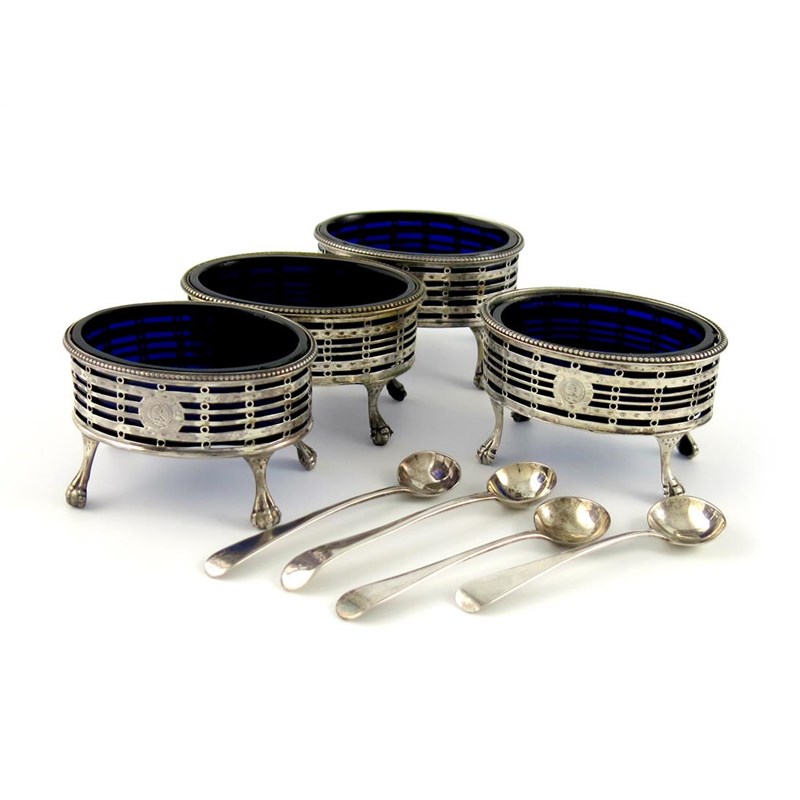oval form, pierced decoration, beaded borders, on four claw and ball feet, with blue glass liners, engraved with a crest, plus four various salt spoons, approx. weight 6.8oz. (8)