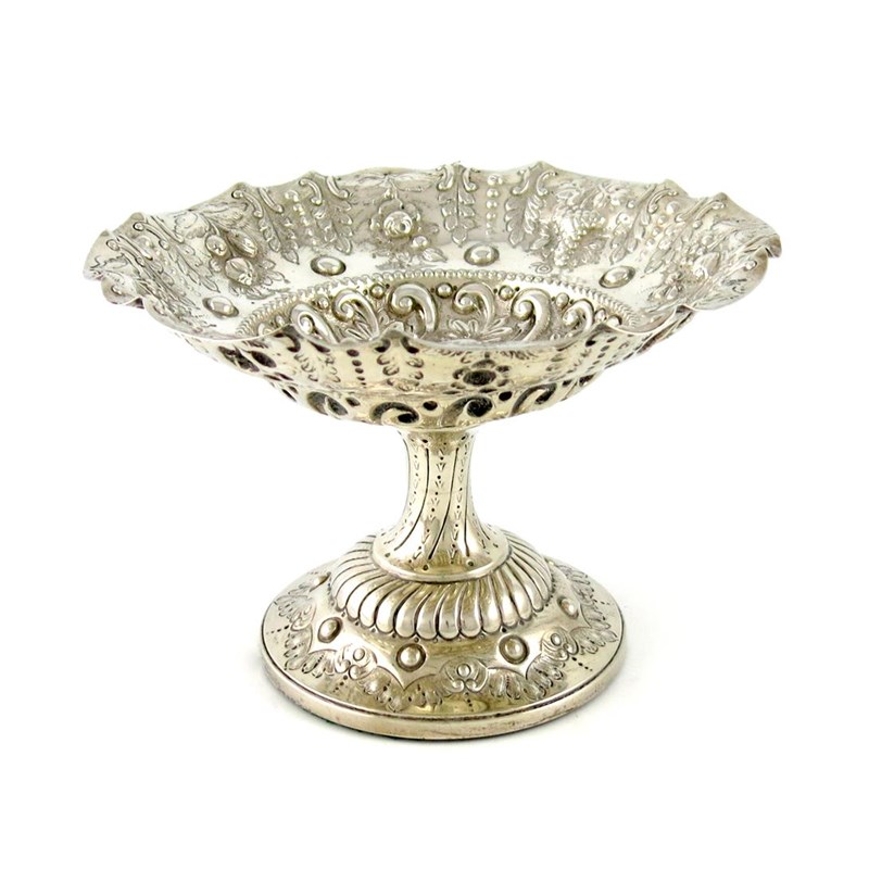 circular form, embossed with fruit and foliate scroll decoration, on a raised part-fluted base, height 20cm.