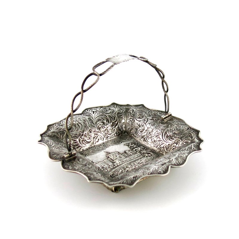 shaped rectangular form, the centre embossed with a view of Windsor Castle within foliate scroll decoration, pierced swing-handle, on a rectangular foot, width 14.5cm, approx. weight 4.2oz.