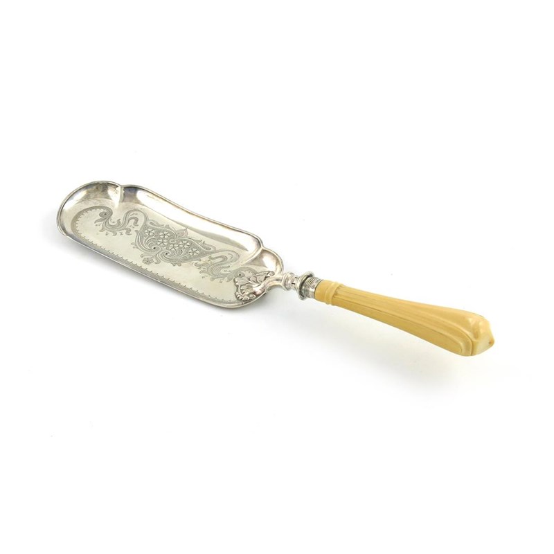 the shaped blade with engraved decoration, carved ivory handle, length 34.5cm.