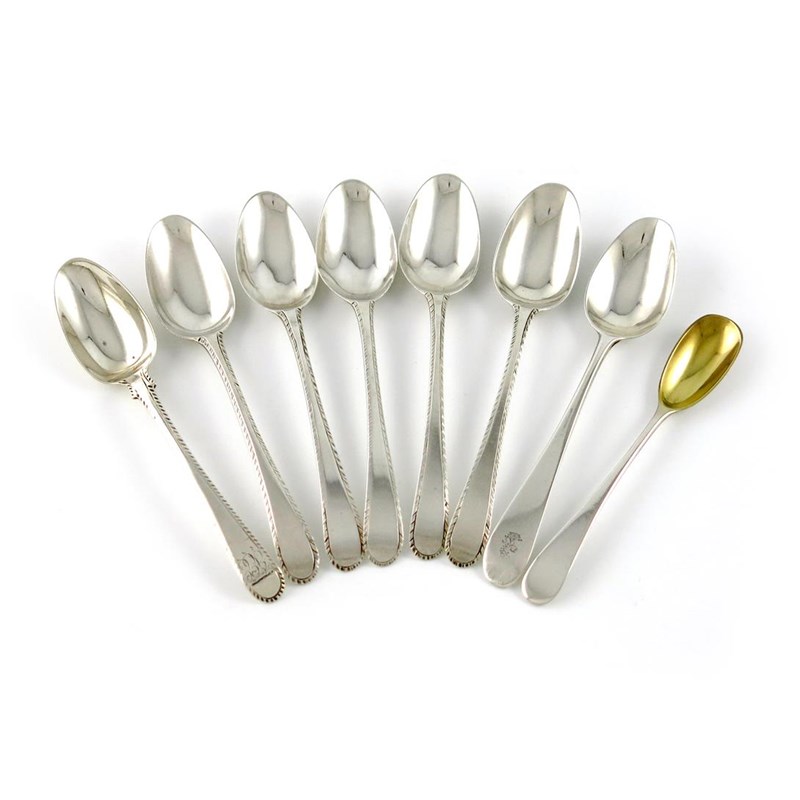 comprising: six various Feather-edge teaspoons, by Hester Bateman, one Old English pattern teaspoon, and a mustard spoon, London 1795, approx. weight 3.3oz. (8)