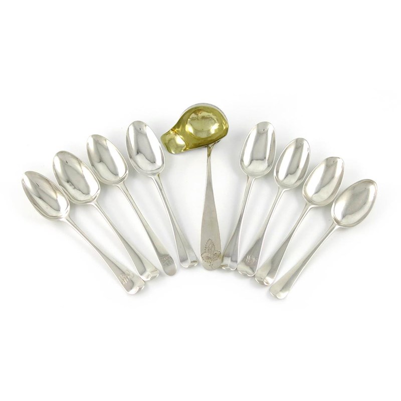 comprising: seven Hanoverian pattern and one old English pattern, the reverse of the terminals with crests and initials, plus a Danish silver lade, approx. weight 10oz. (9)