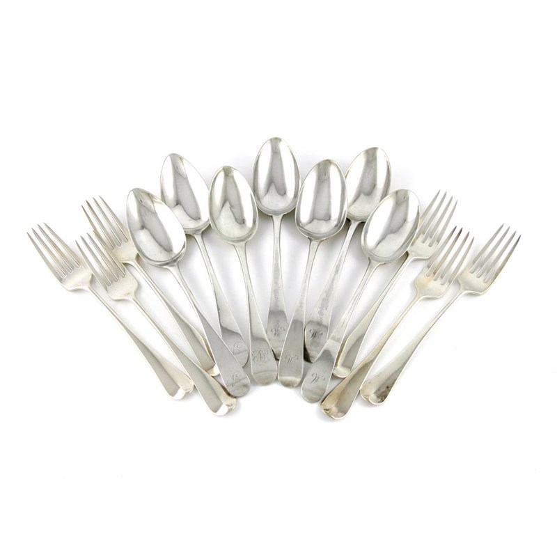 comprising: a set of six Old English pattern table forks, by Ann Robertson, Newcastle 1802, the reverse of the terminals with a crest, plus seven various tablespoons, approx. weight 22.5oz. (13)