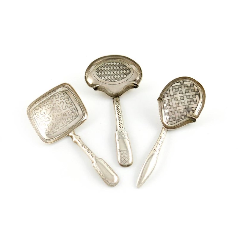 the rounded square bowl with wriggle-work decoration, plus a George III silver caddy spoon by William Pugh, Birmingham 1814, the bowl with chequer board decoration, and another one by William Pugh, Birmingham 1812, approx. weight 0.7oz. (3)